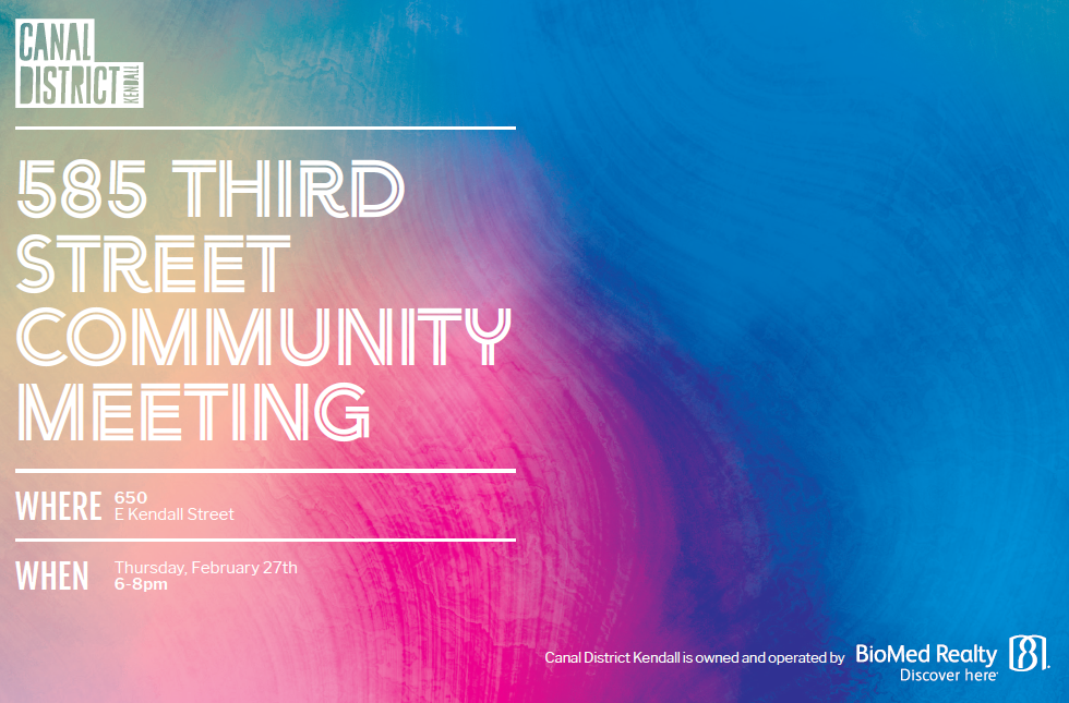 Dear Friend, We are excited to announce the future of 585 Third Street and the Canal District at a special community meeting on Feb. 27 at 650 E Kendall St. Please join the BioMed Realty team as we reveal our plans for this important site, which we hope will provide new energy and vitality to the Cambridge arts scene. Your input—communicated over months of surveys, open houses, and interviews—has played a key role in the design of this project, and we are very excited to share it with you. Refreshments will be provided. ALL ARE WELCOME!